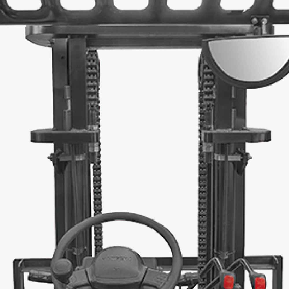 The wide-view mast with optimized design is unlikely to obstruct the operator's line of sight. The enlarged opening size of the fork carriage enables a wider view, a large operation space, and excellent ergonomic design.